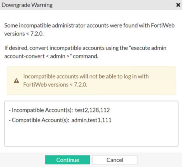 If you downgrade to versions earlier than 7.0, you need to recreate the lost accounts System > Admin > Administrators. The following message will prompt after downgrading: