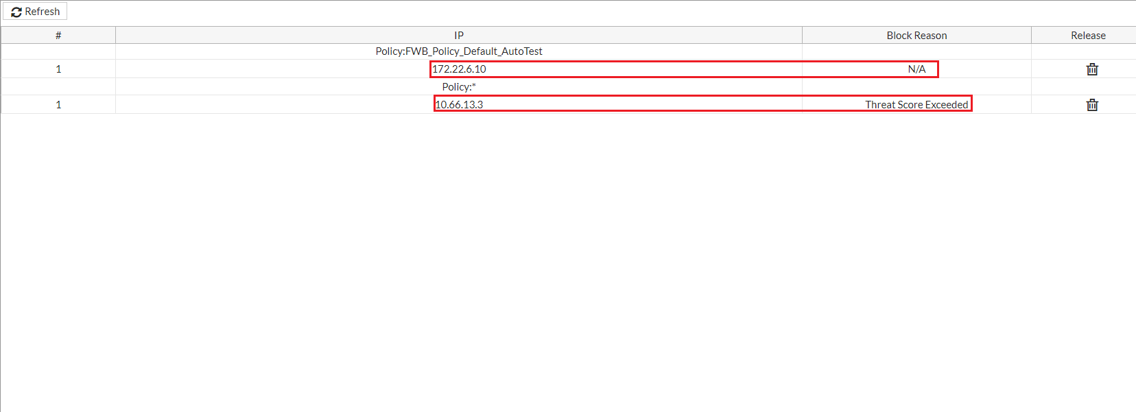 On the Block IPs page, you can see the reason why the IPs are blocked. For period block based on client management configurations, the reason is Threat Score Exceeded; for that caused by other features, the reason is N/A.