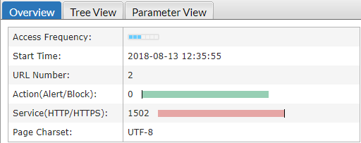 The total number of the alerts, including both Alert action and Alert & Deny action, that has been issued since the start time up to the present moment, as well as the percentage of each in the total number of requests. |
