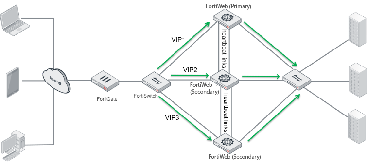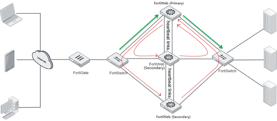 The primary appliance in a standard active-active HA group plays the role as the central controller to receive traffic from clients and send the processed traffic to back-end web servers, and vice versa (the traffic shown in green in the following graph). The primary appliance distributes the traffic to all the HA members (including itself) according to the specified load-balancing algorithm so that each FortiWeb appliance performs the security services to protect the traffic (the traffic shown in red in the following graph).