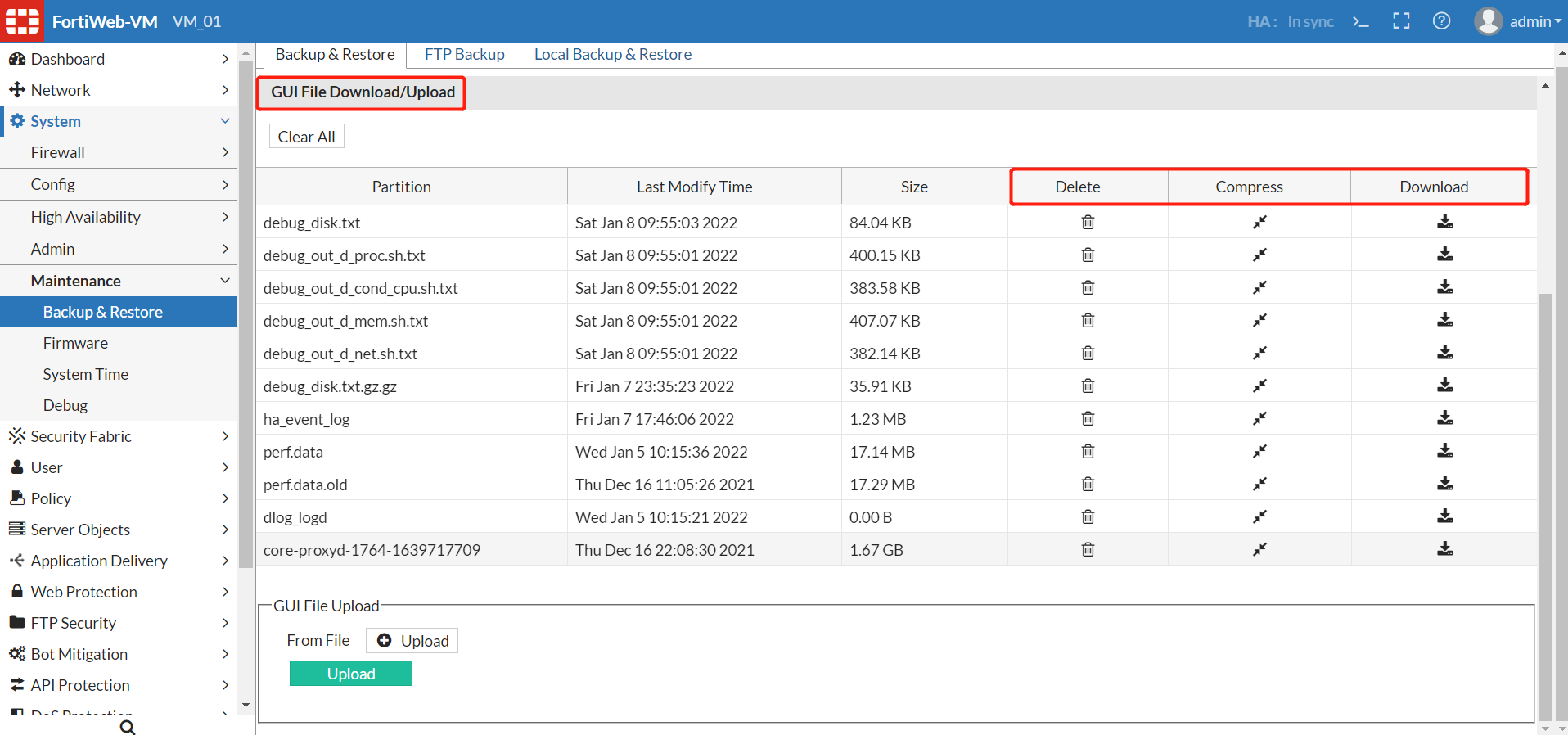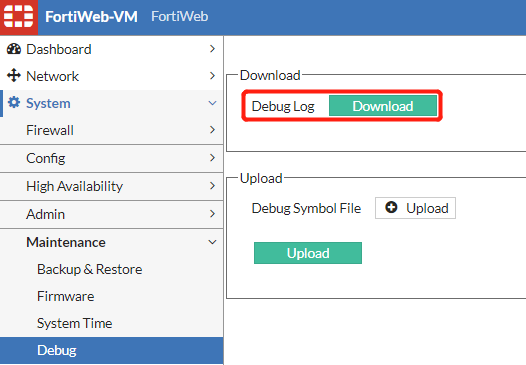 FortiWeb GUI provides an easier way to collect such debug logs. Most logs under /var/log/debug/ and /var/log/gui_upload will be archived after you click the “Download” button on System > Maintenance > Debug > Download section.