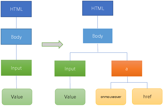 The HTML/JavaScript based XSS injection detection approach does HTML document parsing for the template"<input value="">"and generates the HTML document tree. After filling the user input, the template is<input value="" onfocus="alert(document.cookie)">, and the approach does HTML document parsing for this template.