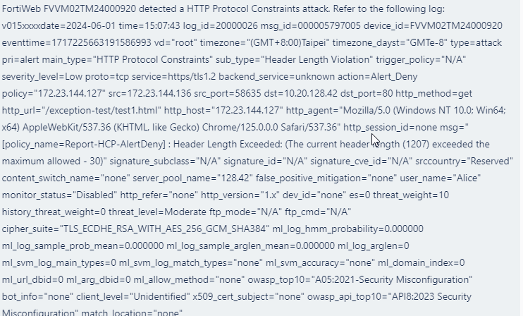 Message Type Text Message FortiWeb has detected a HTTP Protocol Constraints attack. Refer to the following log: