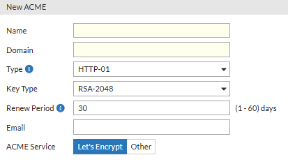 Once you have decided on the ACME certificate provider, you can configure the ACME certificate in FortiWeb. Both Let's Encrypt and Other options are supported as ACME Services; however, if using Other, an EAB Account is required.