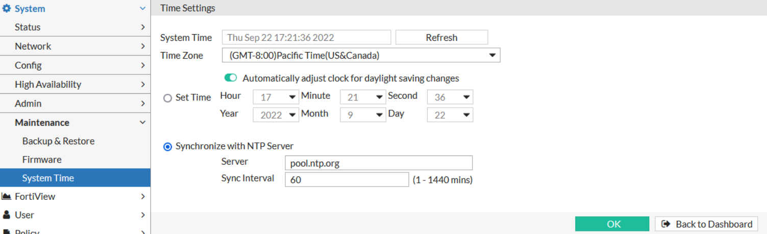 Make sure the system time of the FortiWeb is the same with the time of the AWS instances, otherwise the connector can't work. Please note that sometimes the NTP server breakdown may cause the time to be incorrectly synchronized, which leads to connection failure. If you are troubleshooting the connection issue, highly recommend to check the time on both FortiWeb and AWS instance. If the time is not the same, use the Set Time option in Time Settings, then set FortiWeb's time as the same with the time on AWS instance. |