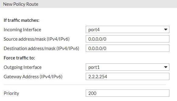 For example, you can create a policy route with the following settings so that all the traffic from the incoming interface port4 will exit FortiWeb through the outgoing interface port1.