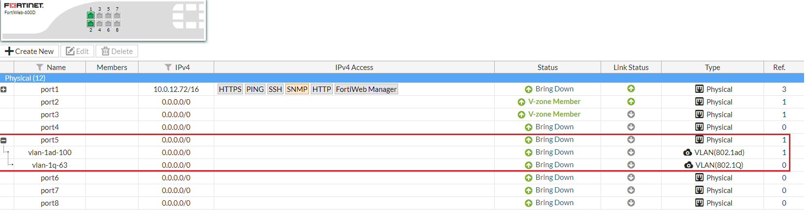 Initially, each physical network port (or, on FortiWeb-VM, a vNIC) has only one network interface that directly corresponds to it — that is, a “physical network interface.” Multiple network interfaces (“subinterfaces” or “virtual interfaces”) can be associated with a single physical port, and vice versa (“redundant interfaces”/”NIC teaming”/”NIC bonding” or “aggregated links”). These can provide features such as link failure resilience or multi-network links.
