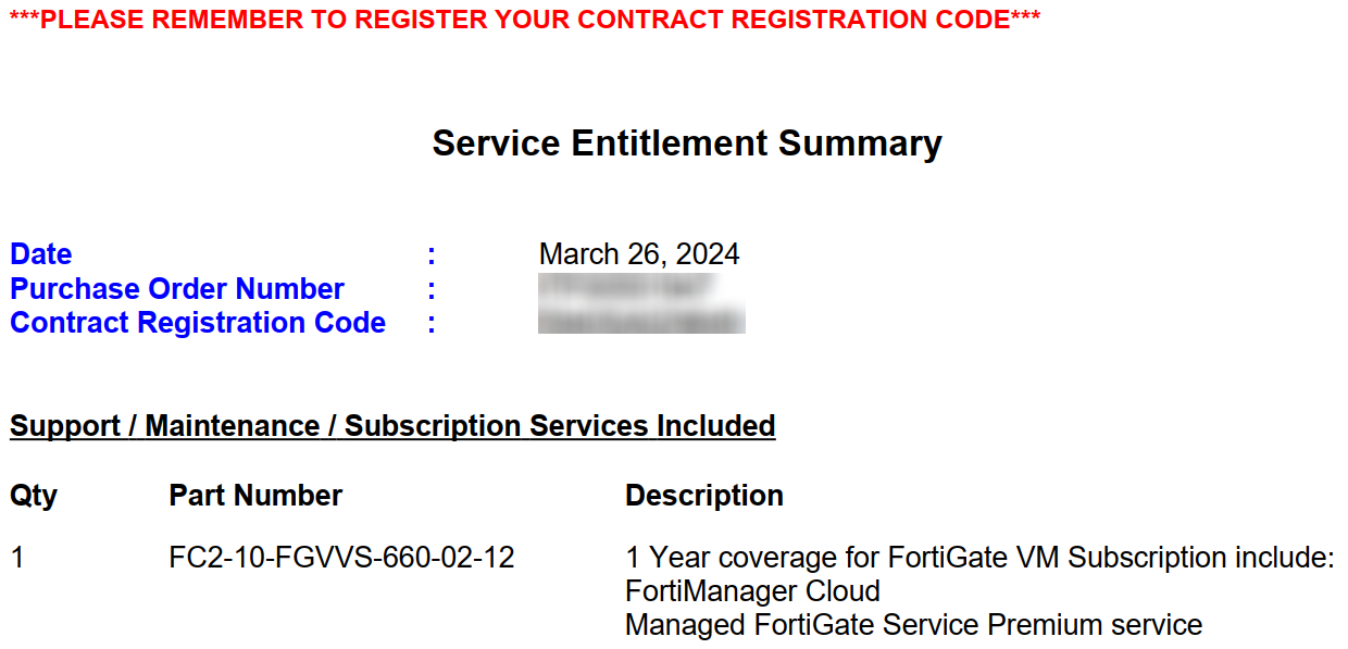 - You should have received an email with your Service Entitlement Summary document. The document includes a Contract Registration Code. In the FortiCloud Registration Code field, enter the Contract Registration Code value from your Service Entitlement Summary.