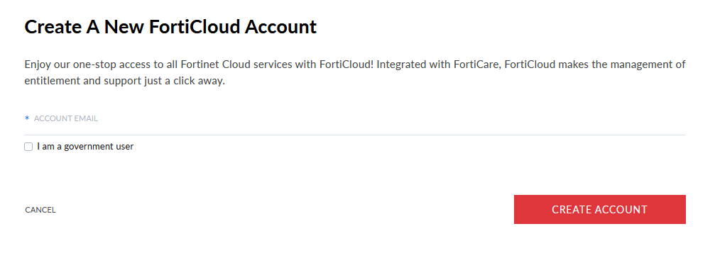 If you don't already have a FortiCloud account, go to FortiCloud and click Create Account. Follow the instructions to create your FortiCloud account.