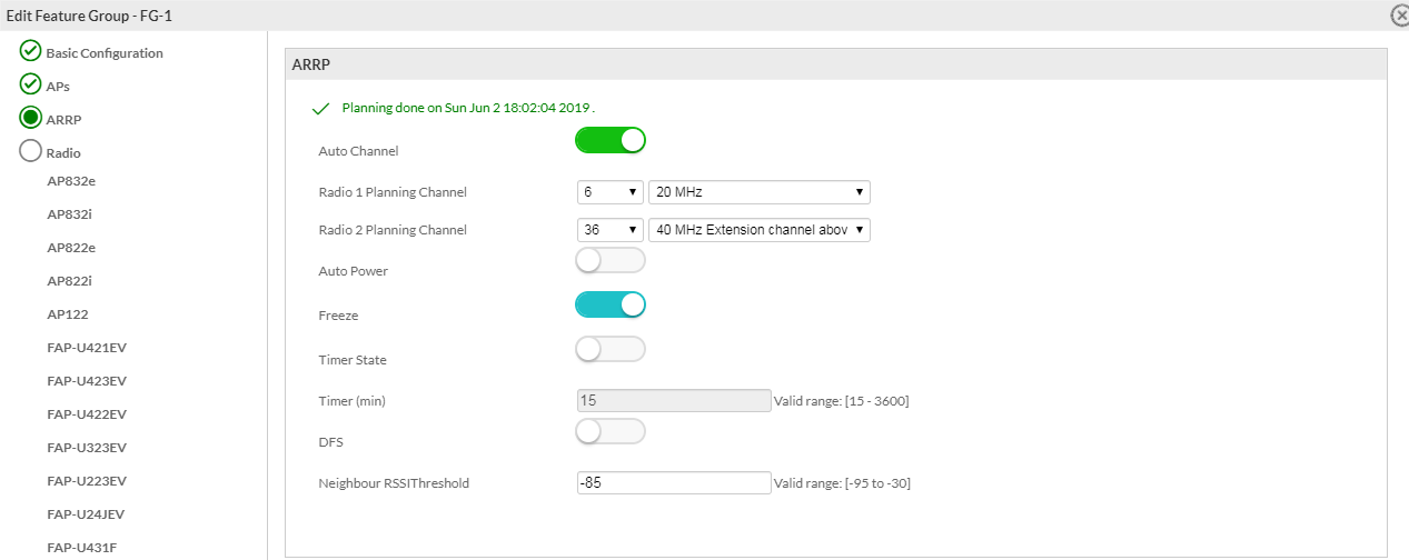 You can now view the ARRP planning status on the Feature Group page. The date and time of the planning are displayed along with the list of overlapping APs (APs sharing channels with their neighbours).