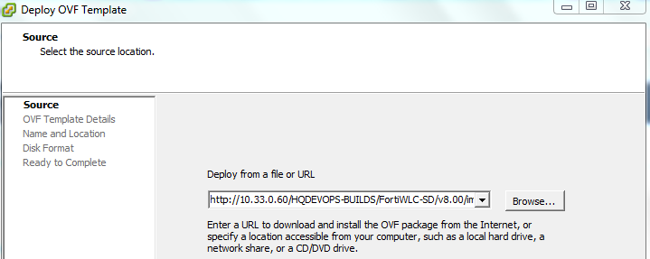 - Browse to the location of the OVA template that you downloaded from Fortinet Support page and click Next.