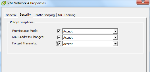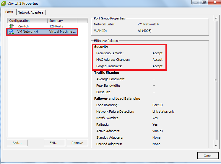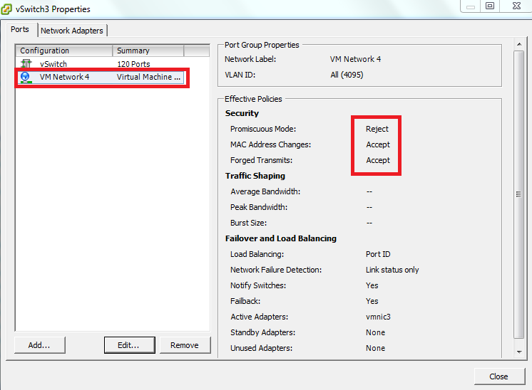 Note: The vSwitch main configuration is set to reject the Promiscuous mode, but the virtual machine port group overwrites the vSwitch configuration and operates in a Promiscuous Mode for the VM Network 4 port group.